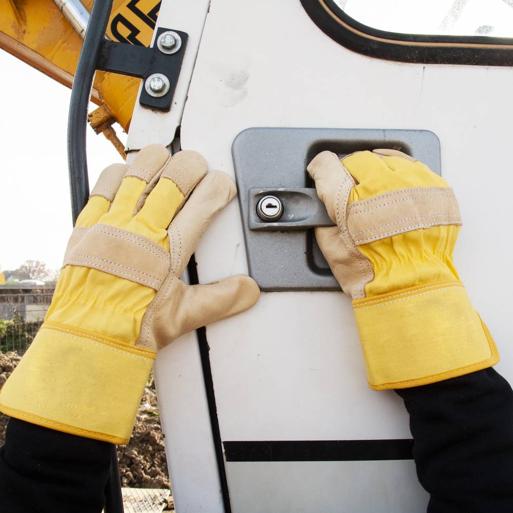 DIN EN 388:2016 Cat. II (2.1.3.3.X), DIN EN 420:2003 + A1:2009,Doppelnaht, gummierte Stulpe, Innenhand gefüttert, superweiches, Top-Rind-VoLeder ca. 1,3 mm,Material: Top-Rind-Vollleder (ca. 1,3mm),Farbe: Gewebe: gelb, Leder: beige SB-Karte, Größe 10