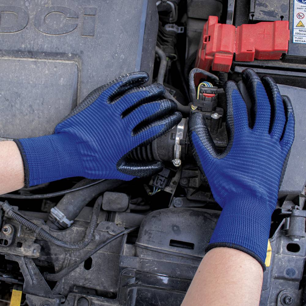 TRIUSO Premium-Line, DIN EN 388:2016 Cat II (3.1.2.1.X), DIN EN 420:2003 + A1:2009,nahtlos und atmungsaktiv, keine Latexproteine, ergonomische Passform, besonders griffig, beständig gegen Öl , Fett und Kohlenwasserstoffe, hohe Abriebfestigkeit,Material: Nylon-Gewebe mit Nitril-Schaum-Beschichtung,Farbe: Gewebe: blau, Beschichtung: schwarz SB-Karte, Größe 11