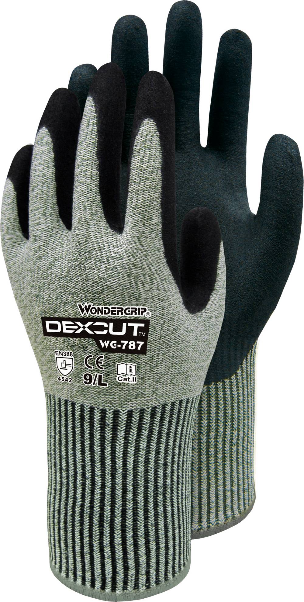 WONDERGRIP, DIN EN 388:2016 Cat II (4.X.4.2.D), ISO13997 Cat D (17 N), Food certification European regulation EC 1935/2004, atmungsaktives nahtloses Strickgewebe, keine Latexproteine, schnittfest - Stufe 5, gute mechanische Eigenschaften, hervorragende Beständigkeit gegen Öl, Fett und Kohlenwasserstoffe, gute Beständigkeit gegen organische Lösungsmittel, hitzebeständig, hohe Abriebfestigkeit. Material: HPPE-Tsunooga-Elasthan (Spandex)-Gewebe mit Nitril-Mikroschaum-Beschichtung, Farbe: grün Auslaufartikel, SB-Karte, Größe 8 / M