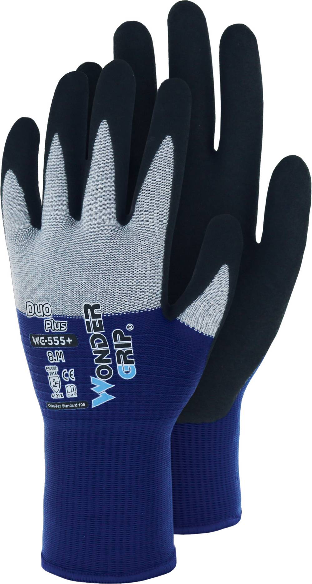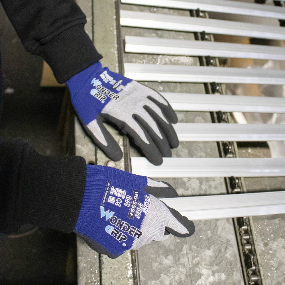 Wondergrip, DIN EN 388:2016 Cat II (4.1.2.1.X), atmungsaktives, nahtloses Strickgewebe, keine Latexproteine, ultradünn, die Kombination aus Mikrofaser und Nylon-Gewebe erzeugt zusammen mit der 2-fachen Nitril-Mikroschaum-Beschichtung eine 360° Atmungsaktivität, die individuelle Quer-und Horizontalstricktechnik verleiht dem "Duo+" eine perfekte Passform und ein sehr gutes Fingergefühl für präzise Arbeiten in trockener Umgebung, hervorragende Beständigkeit gegen Öl, Fett und Kohlenwasserstoffe, sowie eine gute Beständigkeit gegen organische Lösungsmittel. Material: Nylon-Gewebe mit Mikrofaser und 2-facher Nitril-Mikroschaum-Beschichtung, Farbe: grau/blau Auslaufartikel, SB-Karte, Größe 11 / XXL