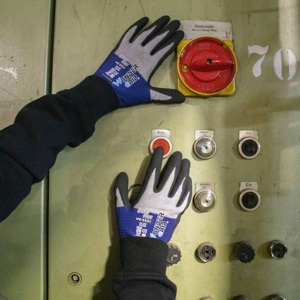 Wondergrip, DIN EN 388:2016 Cat II (4.1.2.1.X), atmungsaktives, nahtloses Strickgewebe, keine Latexproteine, ultradünn, die Kombination aus Mikrofaser und Nylon-Gewebe erzeugt zusammen mit der 2-fachen Nitril-Mikroschaum-Beschichtung eine 360° Atmungsaktivität, die individuelle Quer-und Horizontalstricktechnik verleiht dem "Duo+" eine perfekte Passform und ein sehr gutes Fingergefühl für präzise Arbeiten in trockener Umgebung, hervorragende Beständigkeit gegen Öl, Fett und Kohlenwasserstoffe, sowie eine gute Beständigkeit gegen organische Lösungsmittel. Material: Nylon-Gewebe mit Mikrofaser und 2-facher Nitril-Mikroschaum-Beschichtung, Farbe: grau/blau Auslaufartikel, Polybeutel, Größe 11 / XXL