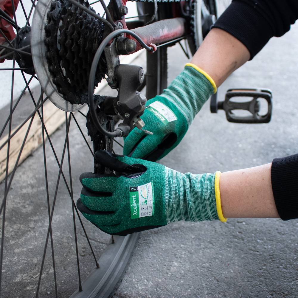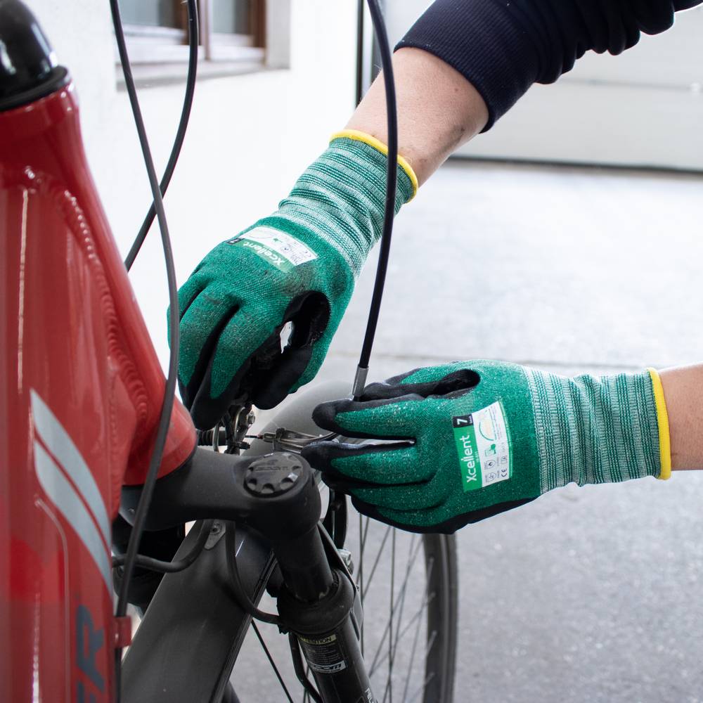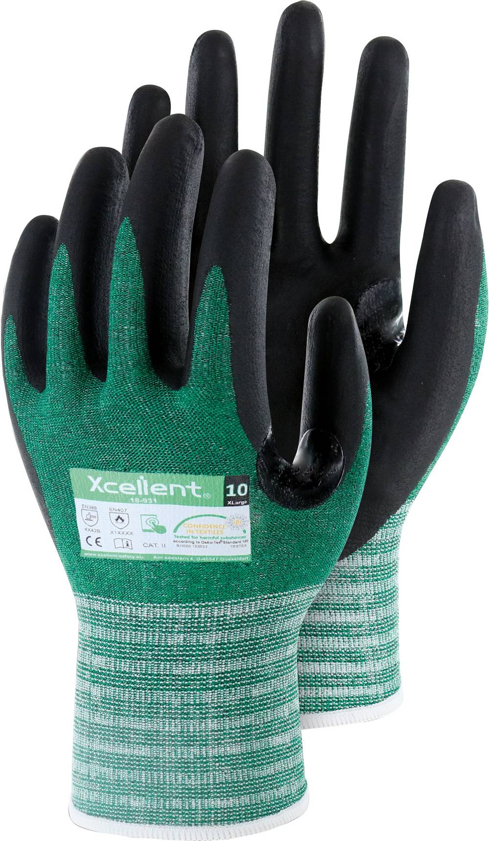 Xcellent, DIN EN 388:2016 Cat II (4.X.4.2.B), DIN EN 407 (X.1.X.X.X.X).Schnittschutzklasse B, Kontakt-Hitzeschutz bis zu 100°C, längere Lebensdauer durch Verstärkung zwischen Zeigefinger und Daumen, perfekte Passform, gute Flexibilität, Anwendungsbereiche: allg. Arbeiten in trockener/feuchter Umgebung, Montage, Wartung, Verpacken,Material: UHMWPE-Gewebe mit Nitril-Mikroschaum-Beschichtung + Verstärkung,Farbe: Gewebe: grün meliert, Beschichtung: schwarz NEU, Polybeutel, Größe 9