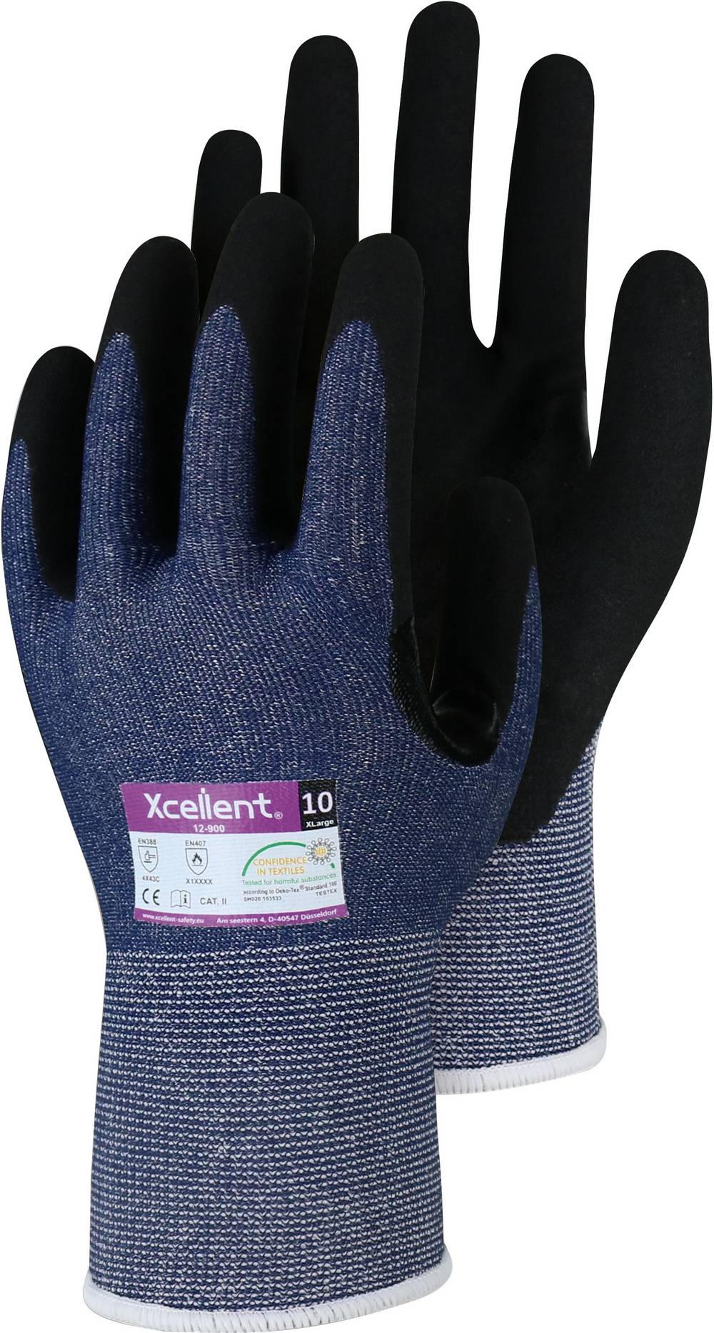 Xcellent, DIN EN 388:2016 Cat II (4.X.4.3.C), DIN EN 407 (X.1.X.X.X.X),Schnittschutzklasse C, Kontakt-Hitzeschutz bis zu 100°C, hohe Abriebfestigkeit, hoher Tragekomfort und extrem weich, gute Flexibilität und Geschicklichkeit, längere Lebensdauer durch Verstärkung zwischen Zeigefinger und Daumen, Anwendungsbereiche: allg. Arbeiten in trockener/leicht öliger Umgebung, Montage, Inspektion, Metall,Material: UHMWPE-Gewebe mit gerauter Nitril-BeschichtungFarbe: Gewebe: dunkelblau meliert, Beschichtung: schwarz NEU, Polybeutel, Größe 9
