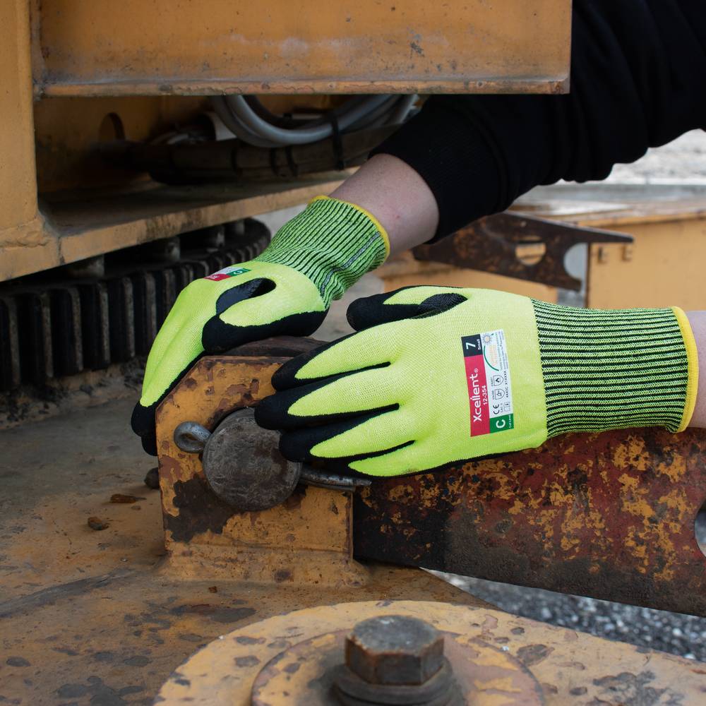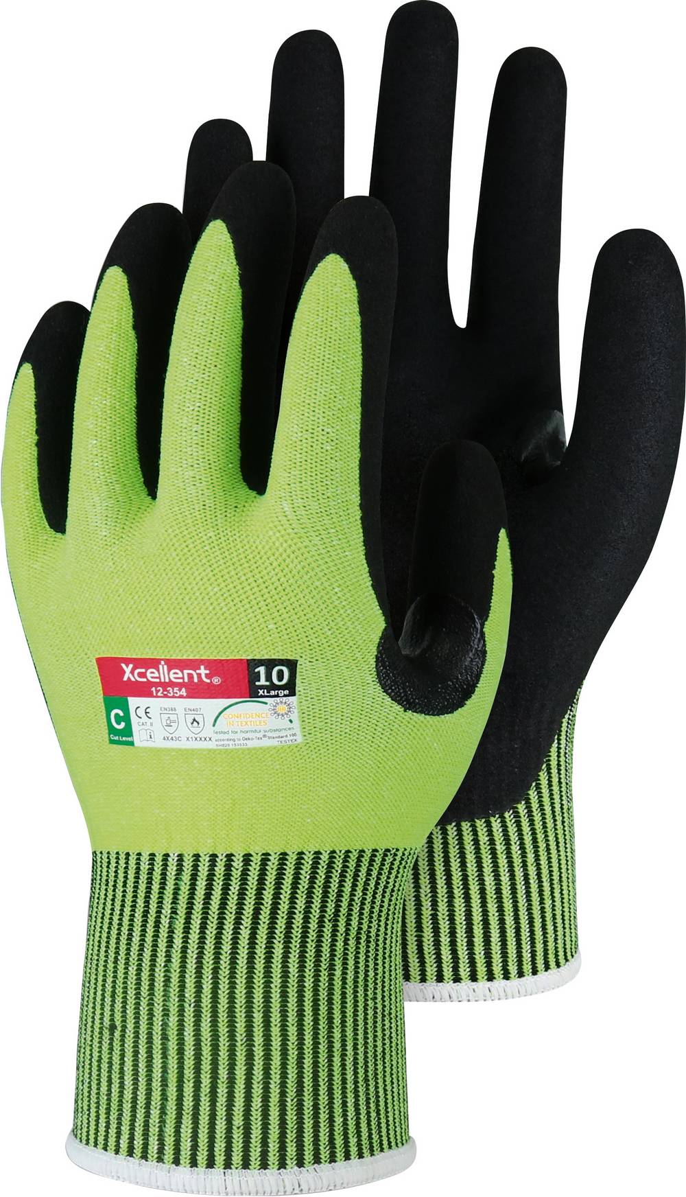 Xcellent, DIN EN 388:2016 Cat II (4.X.4.3.C), DIN EN 407 (X.1.X.X.X.X),Schnittschutzklasse C, Kontakt-Hitzeschutz bis zu 100°C, hohe Abriebfestigkeit und Tragekomfort, gute Flexibilität und Geschicklichkeit, längere Lebensdauer durch Verstärkung zwischen Zeigefinger und Daumen, 360° atmungsaktiv, leuchtgelb für gute Sichtbarkeit, Anwendungsbereiche: allg. Arbeiten in trockener/leicht öliger Umgebung, Montage, Automobilindustrie,Material: UHMWPE-Gewebe mit gerauter Nitril-Beschichtung + Verstärkung,Farbe: Gewebe: leuchtgelb, Beschichtung: schwarz NEU, Polybeutel, Größe 11