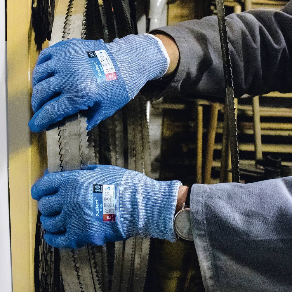 Xcellent, DIN EN 388:2016 Cat II (4.X.4.3.E), DIN EN 407 (X.1.X.X.X.X),hohe Schnittschutzklasse E, Kontakt-Hitzeschutz bis zu 100°C, geeignet für Lebensmittel, gute Flexibilität, gute Passform, Anwendungsbereiche: allg. Arbeiten in trockener Umgebung mit hoher Schnittgefahr, Metall-/Papier- sowie Glasindustrie, Lebensmittelindustrie,Material: Stahlfasern-UHMVPE-Gewebe mit Nitril-Mikroschaum-Beschichtung,Farbe: Gewebe: blau meliert, Beschichtung: blau NEU, Polybeutel, Größe 9