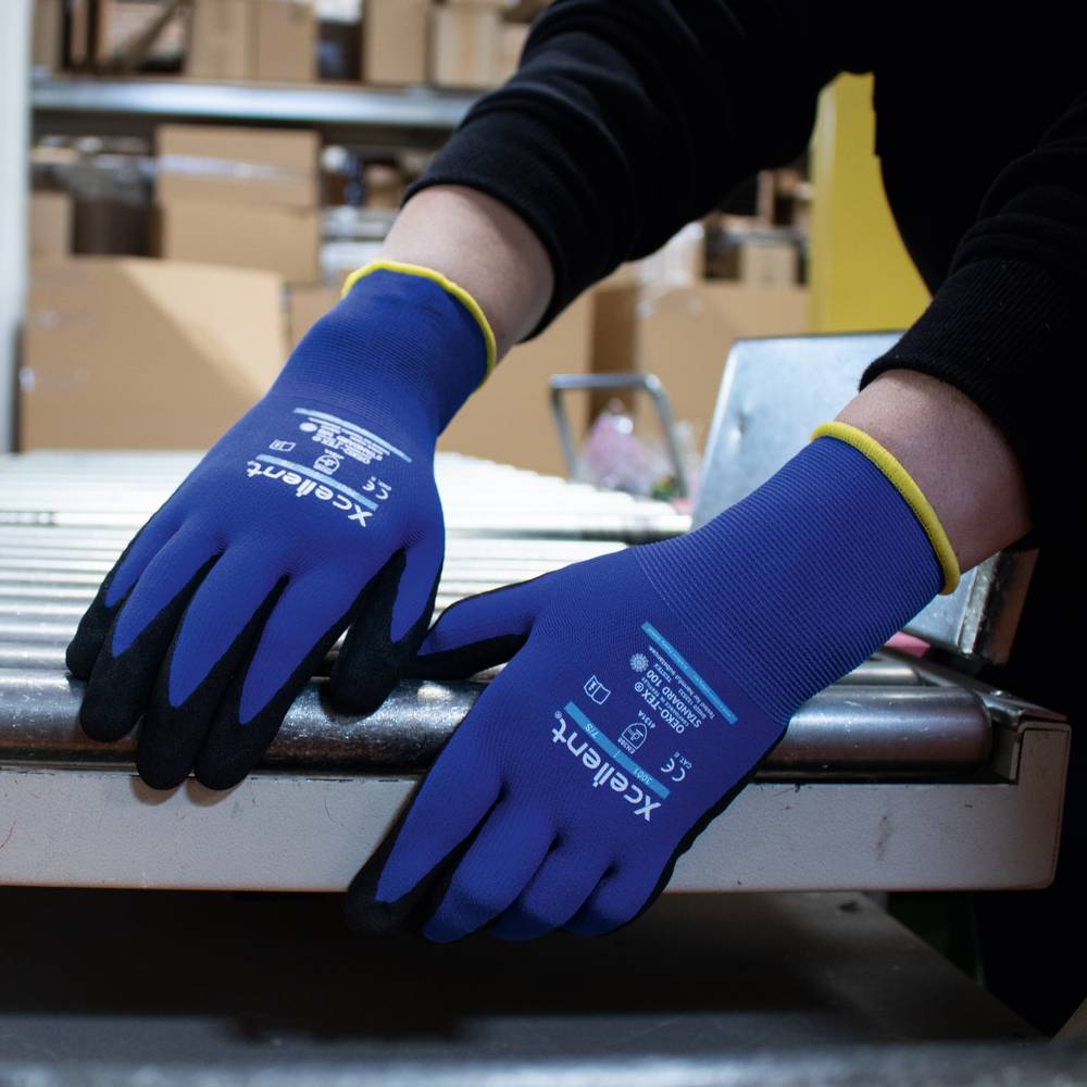 Xcellent, DIN EN 388:2016 Cat II (4.1.3.1.A), Schnittschutzklasse A, hohe Abriebfestigkeit und Tragekomfort, gute Flexibilität, gute Griffigkeit, 360° atmungsaktiv, Anwendungsbereiche: allg. Arbeiten in trockener/leicht öliger Umgebung, Montage, Logistik, Wartung,Material: Nylon-Elasthan (Spandex), Beschichtung: sandiges Nitril,Farbe: blau, Beschichtung: schwarz
