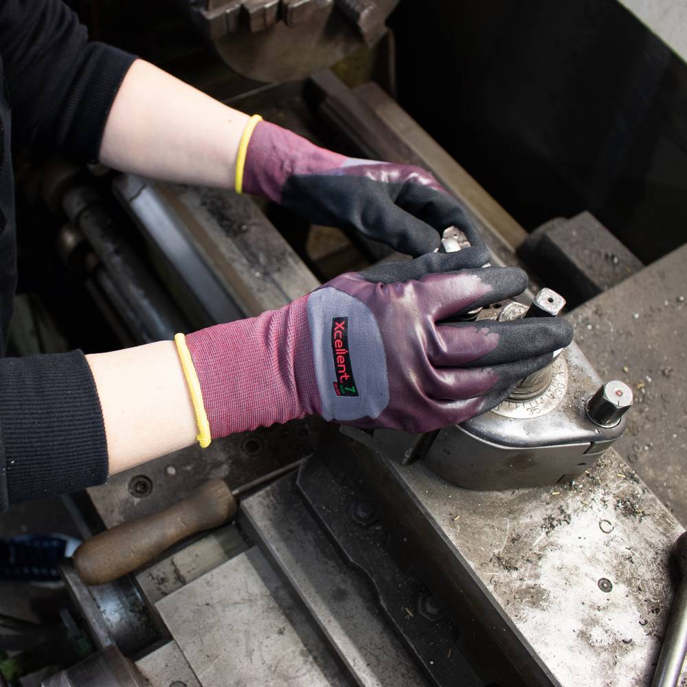 Xcellent, DIN EN 388:2016 Cat II (4.1.2.1.X), DIN EN 407 (X.1.X.X.X.X),Kontakt-Hitzeschutz bis zu 100°C, wasser- und ölabweisend im Beschichtungsbereich, Minimierung der Handermüdung, hohe Abriebfestigkeit, gute Passform, hohe Griffigkeit in trockener und feuchter Umgebung, Anwendungsbereiche: allg. Arbeiten in nasser/öliger Umgebung, Montage, Wartung, Maschinen,Material: Polyamid-Gewebe mit 3/4 flacher + gerauter Nitril-Beschichtung,Farbe: Gewebe: grau/dunkelrot, Beschichtung: dunkelrot/schwarz NEU, Polybeutel, Größe 9