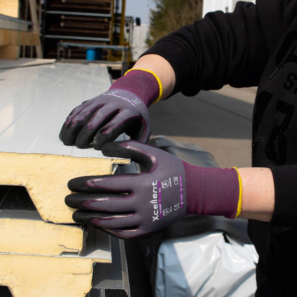 Xcellent, DIN EN 388:2016 Cat II (4.1.2.1.X), DIN EN 407 (X.1.X.X.X.X),Kontakt-Hitzeschutz bis zu 100°C, wasser- und ölabweisend im Beschichtungsbereich, Minimierung der Handermüdung, hohe Abriebfestigkeit, gute Passform, hohe Griffigkeit in trockener und feuchter Umgebung, Anwendungsbereiche: allg. Arbeiten in nasser/öliger Umgebung, Montage, Wartung, Maschinen,Material: Polyamid-Gewebe mit flacher und gerauter Nitril-Beschichtung,Farbe: Gewebe: grau-dunkelrot, Beschichtung: weinrot-schwarz NEU, Polybeutel, Größe 9