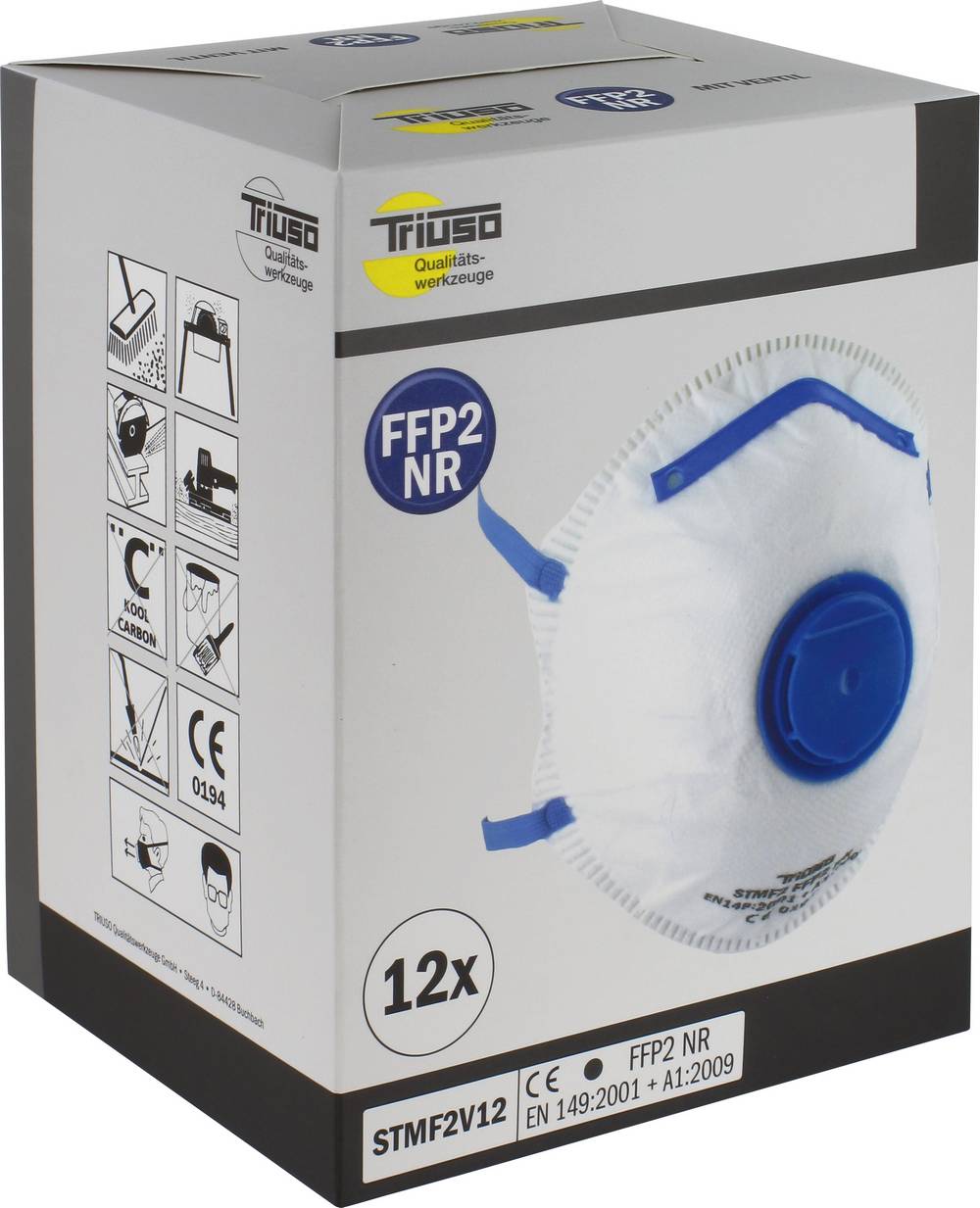 DIN EN 149:2001 + A1:2009 Cat III, Typ: FFP2, mit Ausatemventil, zwei Kopfbänder, gepolsterter Nasenbügel,Einsatzgrenzen: 10-facher Arbeitsplatzgrenzwert gegen feste und flüssige Stoffe auch gegen Partikel krebserregender Stoffe, Bakterien, Pilze und Sporen SB-Karte, 2 Stück, FFP2