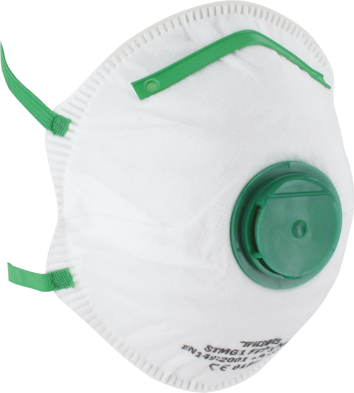 DIN EN 149:2001 + A1:2009 Cat III, Typ: FFP1,mit Ausatemventil, zwei Kopfbänder, gepolsterter Nasenbügel,Einsatzgrenzen: 4-facher Arbeitsplatzgrenzwert gegen reizende, juckende Feinstäube und wässrige Aerosole, wie z. B. Zement-, Farb-, Rost-, Ziegelstaub, Wasserlacke, Dispersionsfarben SB-Karte, 3 Stück, FFP1