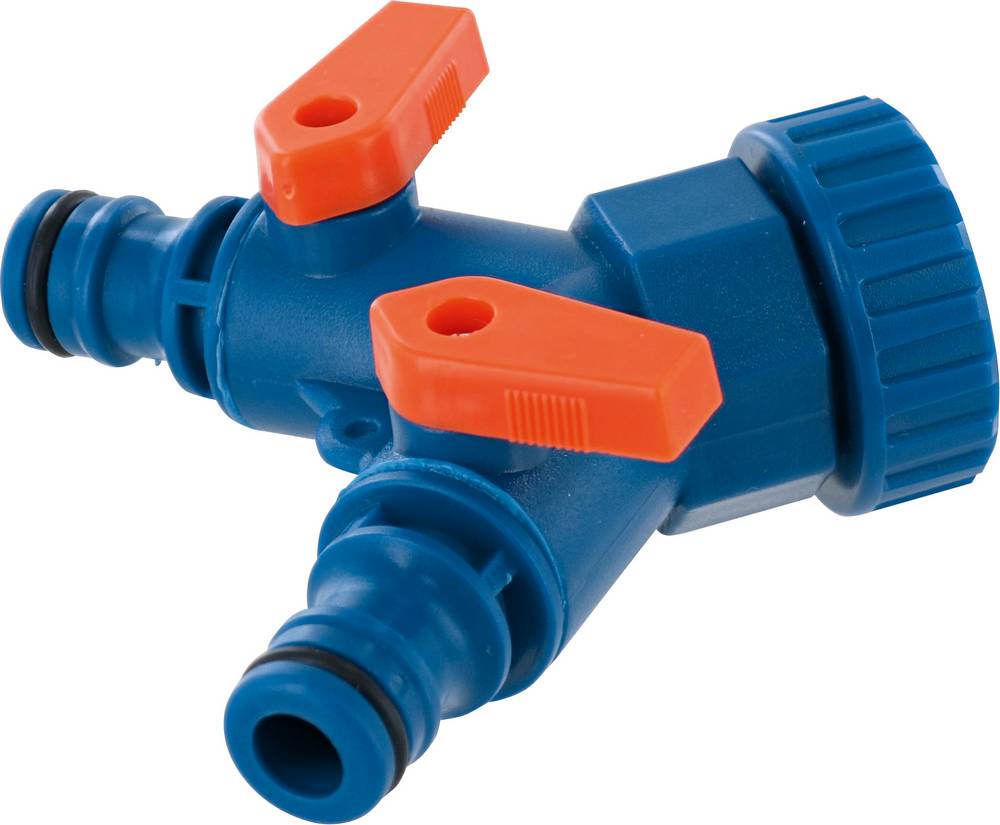 Kunststoff, Y-Verteiler mit Absperrhähnen und 2x System-Stecker. Hahnanschluss: Innengewinde IG 1", mit Reduzieradapter IG 3/4" NEU, IG 1" / IG 3/4"