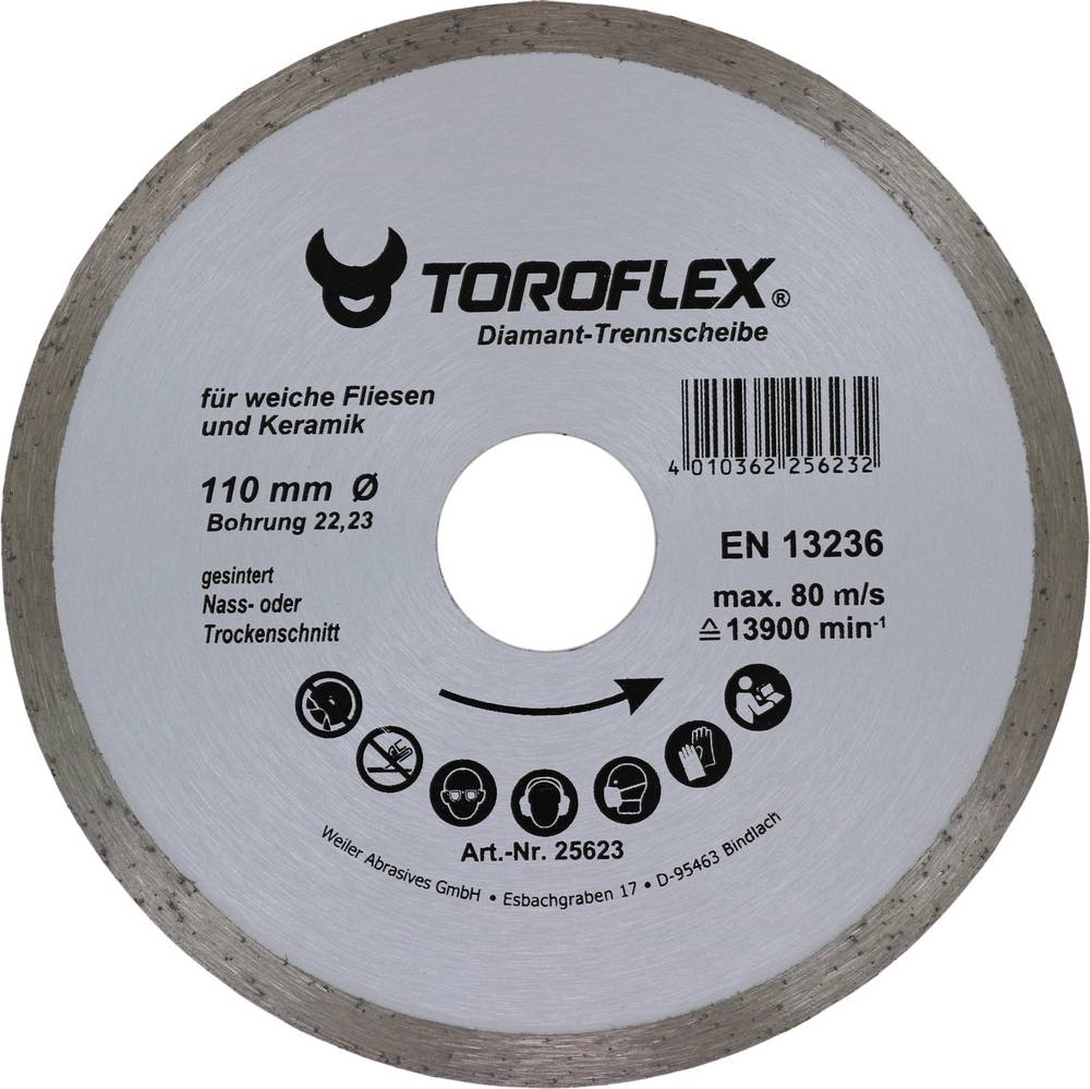 toroflex, Universal-Fliesenscheibe mit geschlossenem Schneiderand, gesintert, besonders geeignet zum Trennen von weichen, glasierten Fliesen, Trockenschnitt, Segmenthöhe 5 mm, Innen-ø 22,2 mm, ø 110 x 1,4 mm