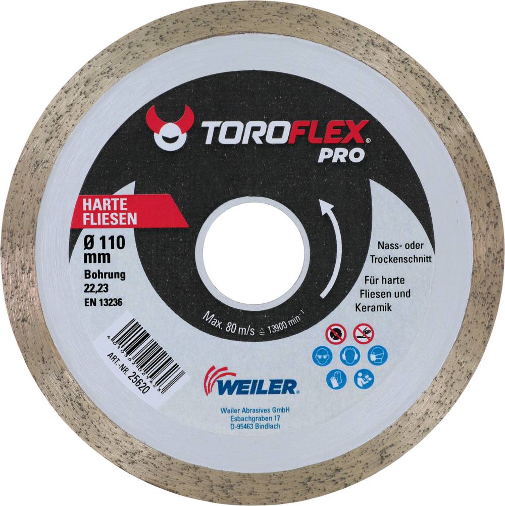 toroflex, Profi-Fliesenscheibe mit geschlossenem Schneiderand, gesintert, besonders geeignet zum Trennen von mittelharten und härteren Fliesen, Trockenschnitt, Segmenthöhe 7 mm, Innen-ø 22,2 mm ø 110 x 1,5 mm