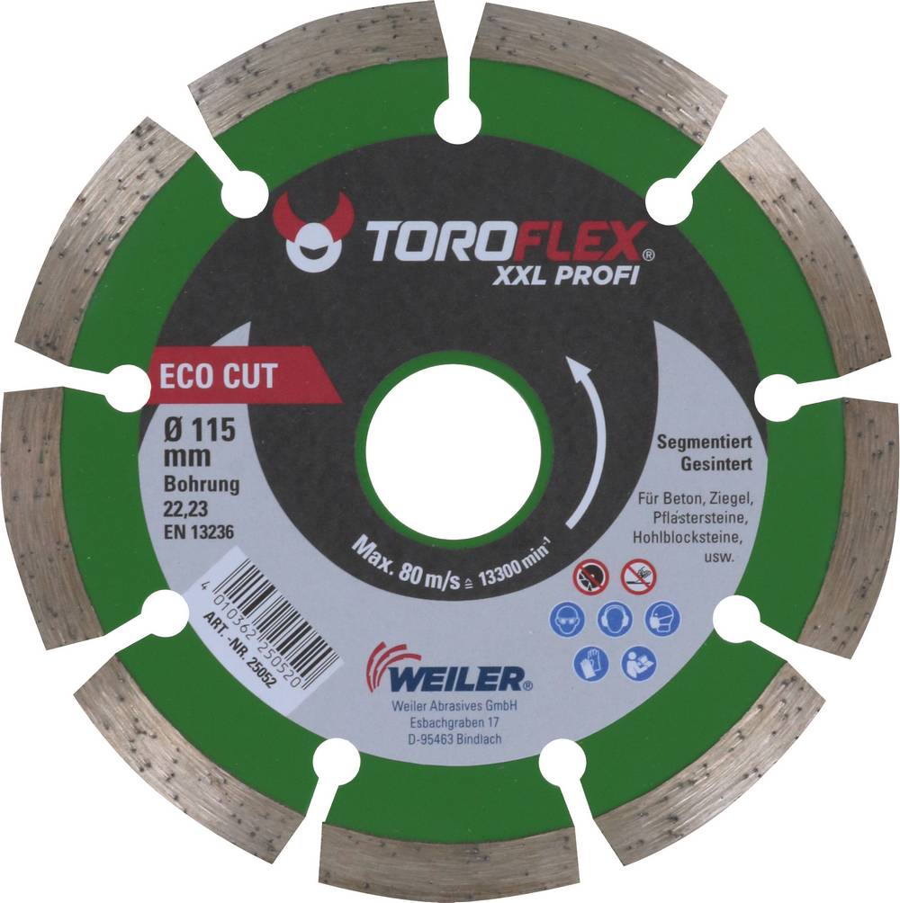 toroflex, Universalscheibe, segmentierter Schneiderand, gesintert, für wechselnde Anwendung. Hauptanwendung: Beton, Betondachpfannen, mittelharte Steine, abrasives Baustellenmaterial, Segmenthöhe 8 mm, Innen-ø 22,2 mm ø 115 x 2,0 mm