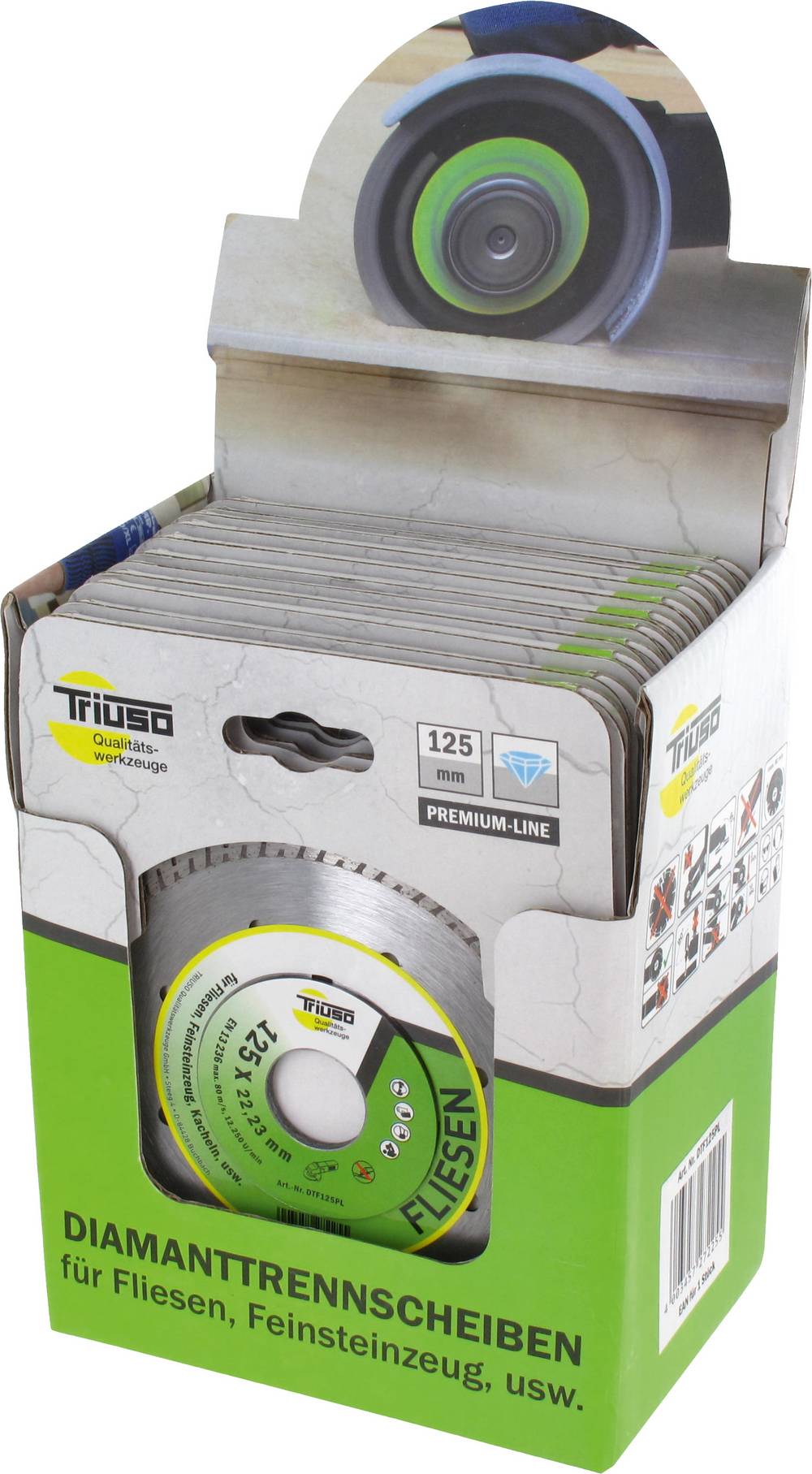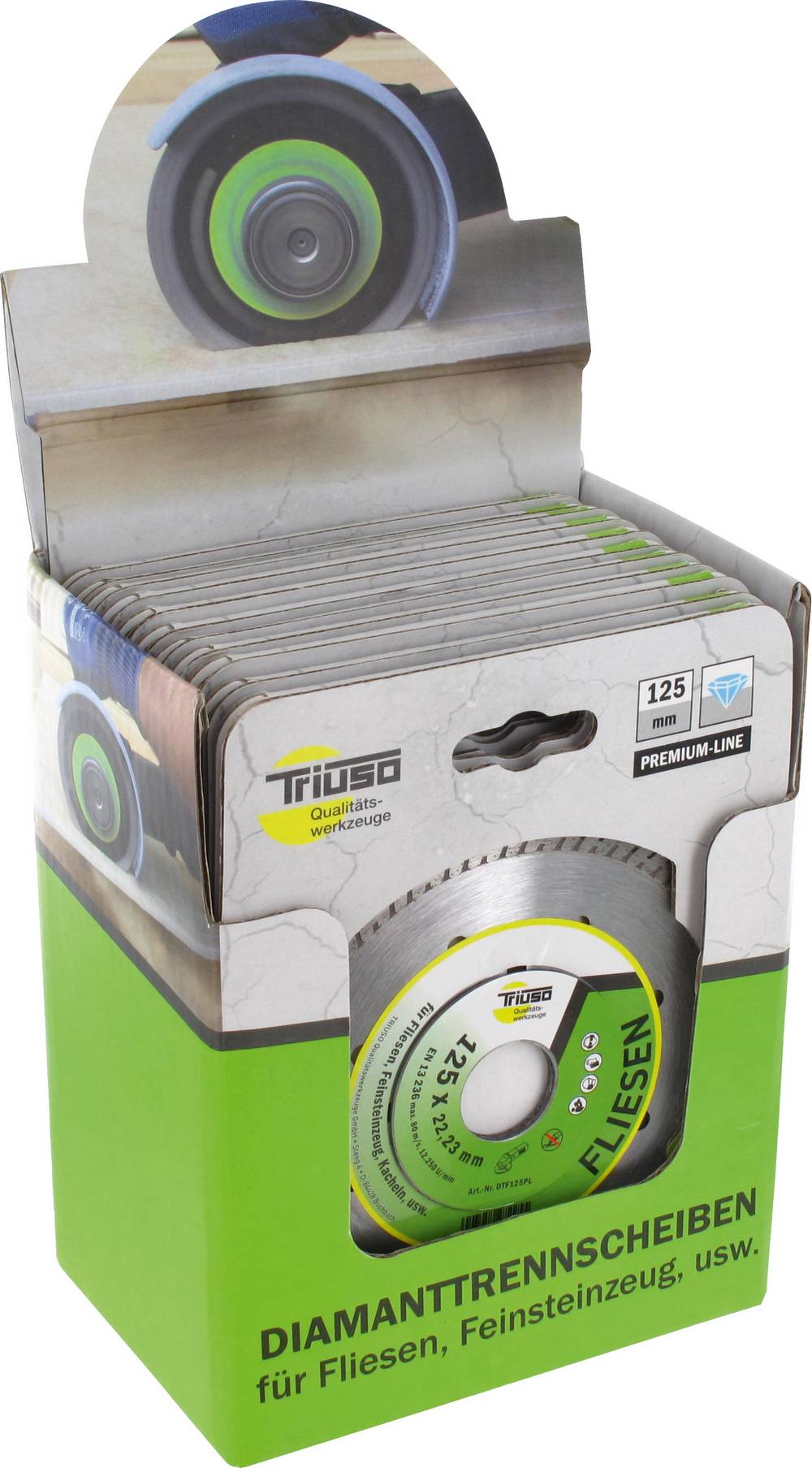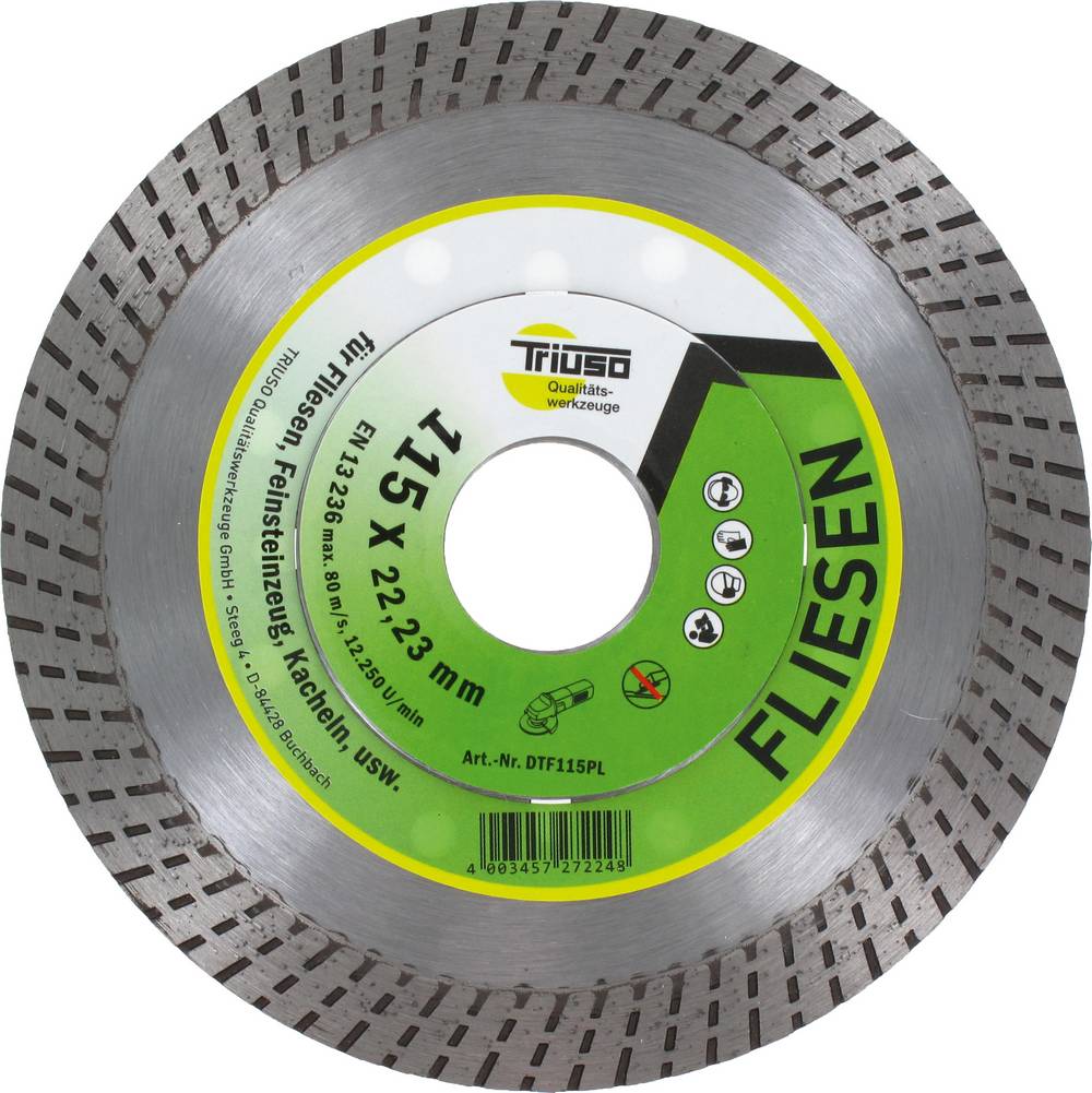 TRIUSO Premium-Line, für Fliesen, Kacheln, Feinsteinzeug, Diamant Trennscheibe für höchste Ansprüche an genaue, ausrissfreie Schnittkanten in harten Materialien wie extrem harten Feinsteinzeug (GRES) und Naturstein, - hohe Schnittgeschwindigkeit in allen Fliesen, - Flansch minimiert die Vibration und erhöht die Stabilität, - 11 mm Segmenthöhe, Einsatzbereiche: Fliesen, Feinsteinzeug, Kacheln, Granitplatten dünn, Hartgestein, Marmor, Porzellan, usw. ø 115 x 1,2 mm