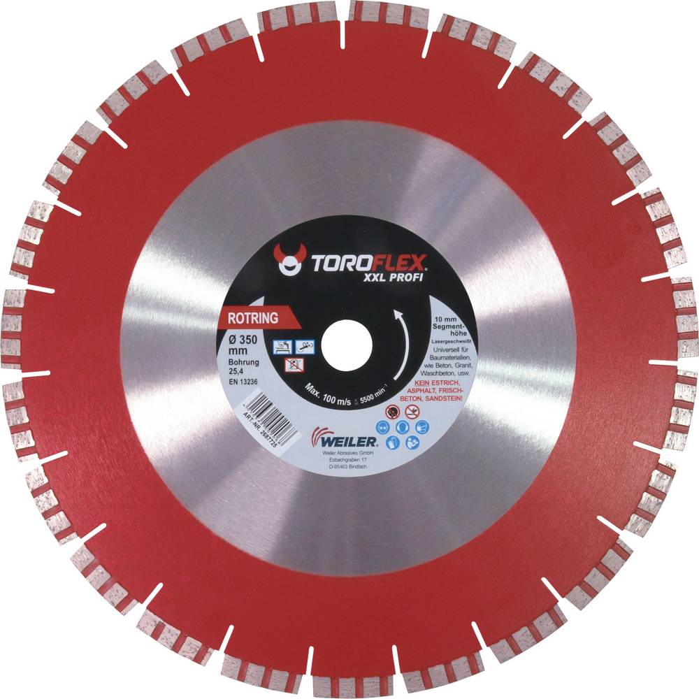 toroflex, Trennscheibe "ROTRING", für Beton, Granit, usw. lasergeschweißt, mit Turbosegmenten, Segmenthöhe 10 mm, Innen-ø 25,4 mm für Trennschleifer ø 350 x 3,0 mm