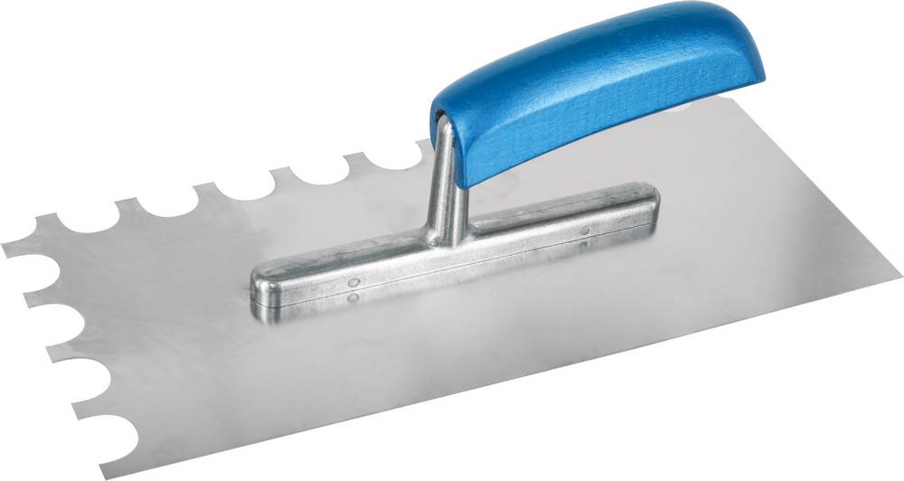 TRIUSO Premium-Line, für Mittelbettmörtel, Bandstahl, Blattstärke 0,7 mm, Zahnung: 20 mm breit und 10 mm tief, mit blauem Holzgriff 20 x 10 mm, 130 x 280 mm
