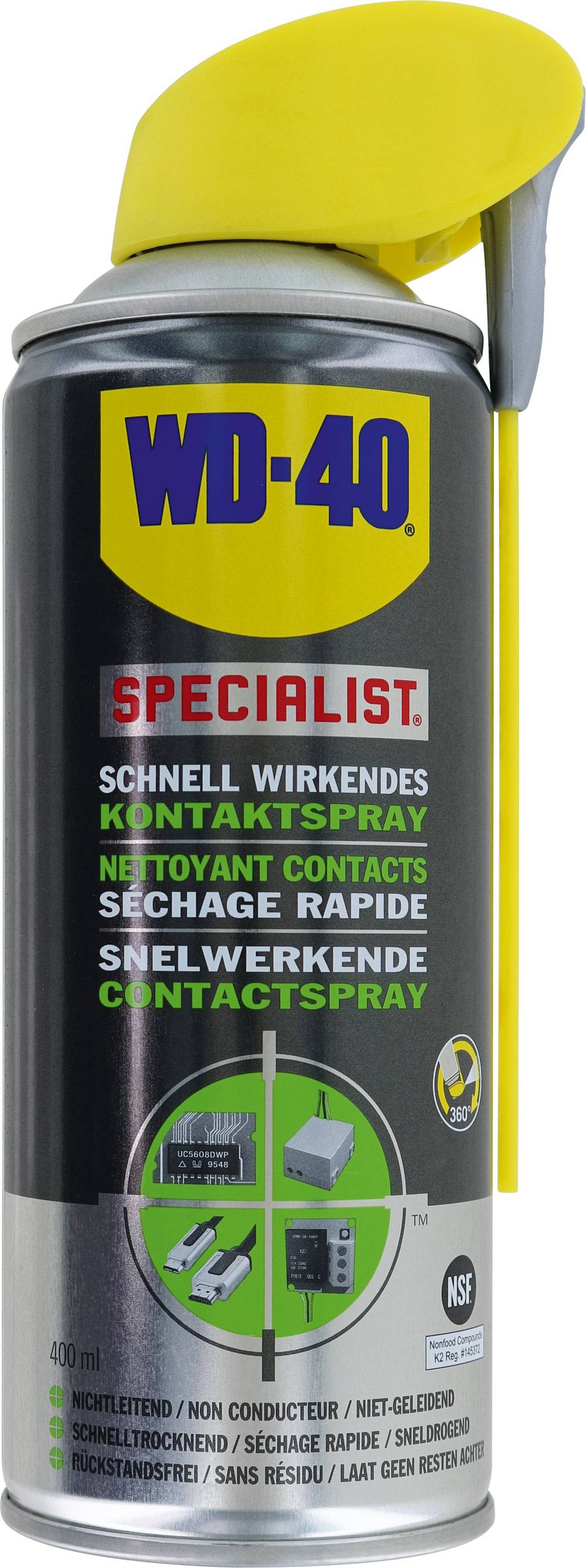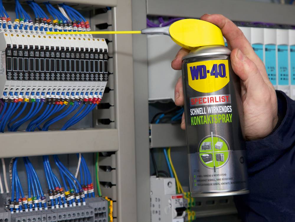 WD-40, Wenn Strom im Spiel ist, braucht es spezielle Pflege. Das schnell wirkende Kontaktspray entfernt Öl, Schmutz und Oxidationsrückstände von empfindlichen elektrischen oder elektronischen Geräten. Das Beste: Es kommt auch an schwer zugängliche Stellen und reinigt, ohne Rückstände zu hinterlassen.Ihre Vorteile: schnell wirkend und nicht leitend, trocknet schnell und rückstandslos, für elektronische Geräte, Kontakte, Kunststoffe und Gummi,Ideal z.Bsp. für: Elektromontage, Platinen, Steuerungen, Drucker und vieles mehr.Exakt dosierbar mit dem WD-40 Smart Straw™ Auslaufartikel, 400 ml