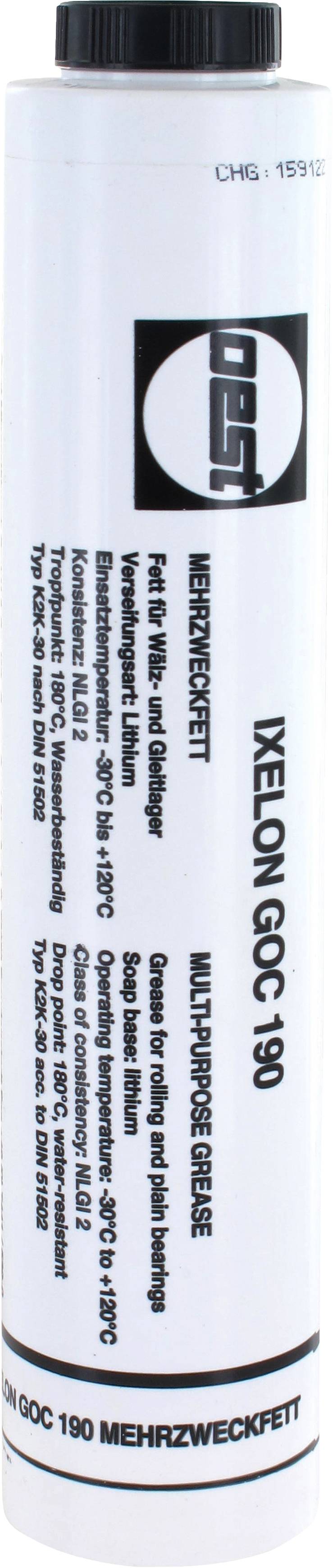Oest, Ixelon LT 190 EP, aus hochwertigen Rohstoffen hergestelltes Mehrzweckfett mit chemisch wirkenden EP-Zusätzen, außerordentlich beständig gegenüber Wärme, Oxidation, Wasser und hoher Druckbelastung, geschmeidig und walkfest, haftfähig, korrosionsschützend, alterungsbeständig, für Wälz- und Glattlager sowie sonstige Schmierstellen im Fahrzeug-, Baumaschinen- und Industriemaschinen-Bereich, auch bei hohen Druck- oder Stoßbelastungen und Vibrationen, Schraubpatrone für Lube-Shuttle® Fettpresse, Öffnen der Kartusche ohne zusätzliches Werkzeug möglich, einfaches und sauberes Laden der Fettpresse, optimale, wirschaftliche und umweltfreundliche Restentleerung, Schraubdeckel kann als Abdeckkappe zum Schutz wiederverwendet werden, Seifenbasis: Lithium 12-Hydroxystearat, Konsistenzsklasse: NLGI-Klasse 2, DIN 51818, Gebrauchstemperatut: -30 - 120 °C, Tropfpunkt: 180°C, Bezeichnung nach DIN 51502: KP2 K-30 400 g