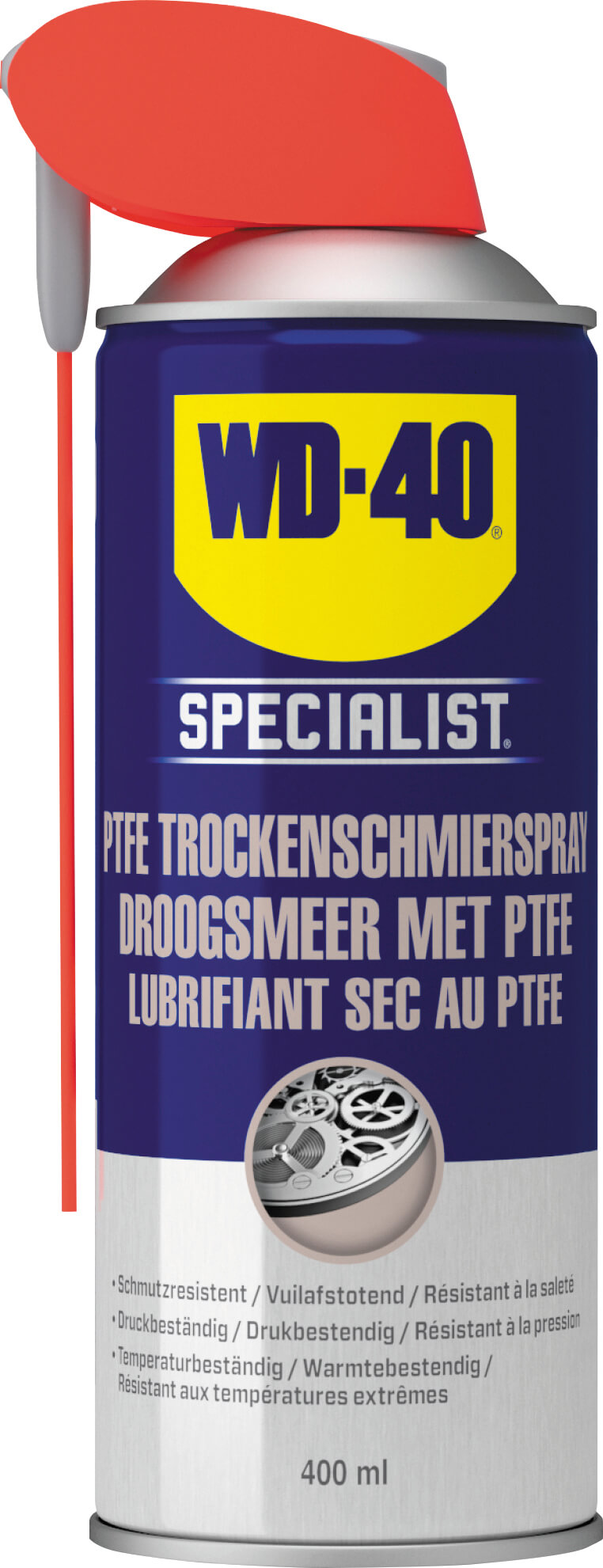 WD-40, Speziell dort, wo eine hohe Temperatur oder viel Druck auftritt, ist das neue reibungsreduzierende Trockenschmierspray mit dem Festschmierstoff PTFE die beste Empfehlung. Sein klarer Trockenschmierfilm zieht weder Staub, Schmutz noch Öl an und sorgt zuverlässig für einwandfreie Funktion und leichten Lauf. Außerdem ist es auch ein hervorragendes Gleit- und Trennmittel.Ihre Vorteile: reduziert Reibung und Verschleiß, schnell trocknend, hohe Temperaturbeständigkeit, für Metalle, Kunststoffe und Glas, wirkt zwischen -45° C und +260° C,Ideal für z. B.: Elektrowerkzeuge, Tür- und Fensterführungen, Schlösser, Thermoplasten und vieles mehr.Exakt dosierbar mit dem WD-40 Smart Straw™