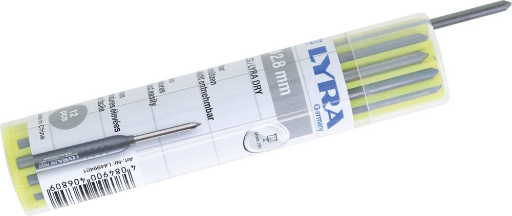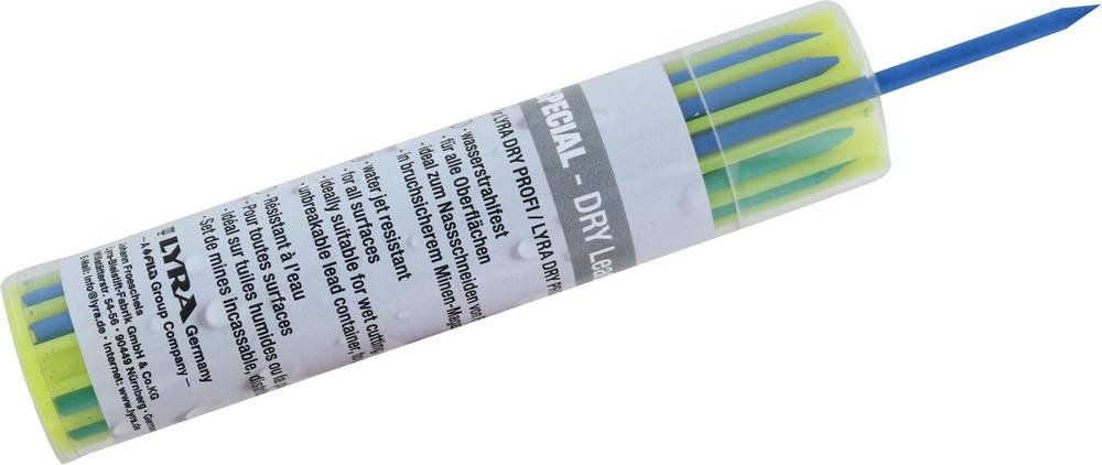 LYRA, ø 2,8 mm x 100 mm, praktische, sichere Entnahme, 12 Minen im Magazin, komfortable Entnahme durch verbessertes bruchsicheres Minenmagazin, vor zu hohen Temperaturen schützen. Set Basic: 6x Graphitminen, 3x rot, 3x gelb - von glatten Flächen abwischbar (rot/gelb - vor zu hohen Temperaturen schützen). Set Graphit: 12x Graphitminen Härte 2B - von glatten Flächen abwischbar. Set Special: 4x blau, 4x grün, 4x weiß - wasserstrahlfest Graphit