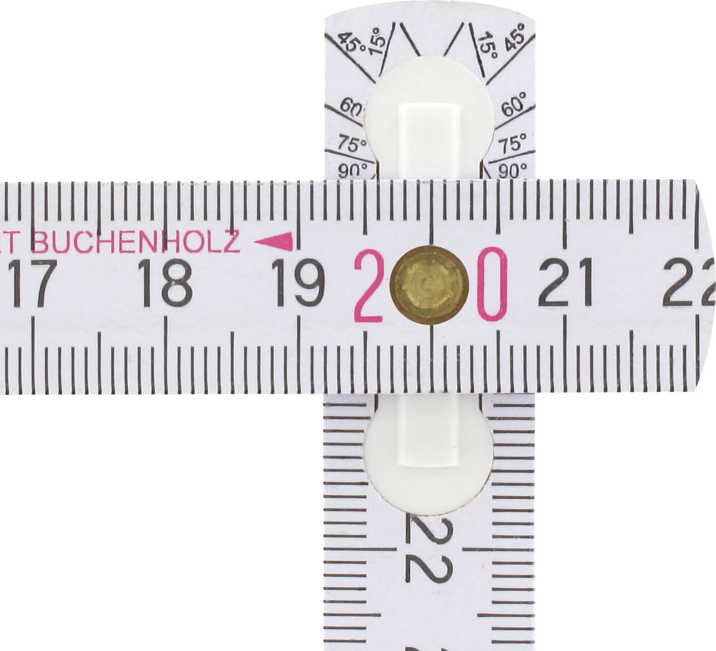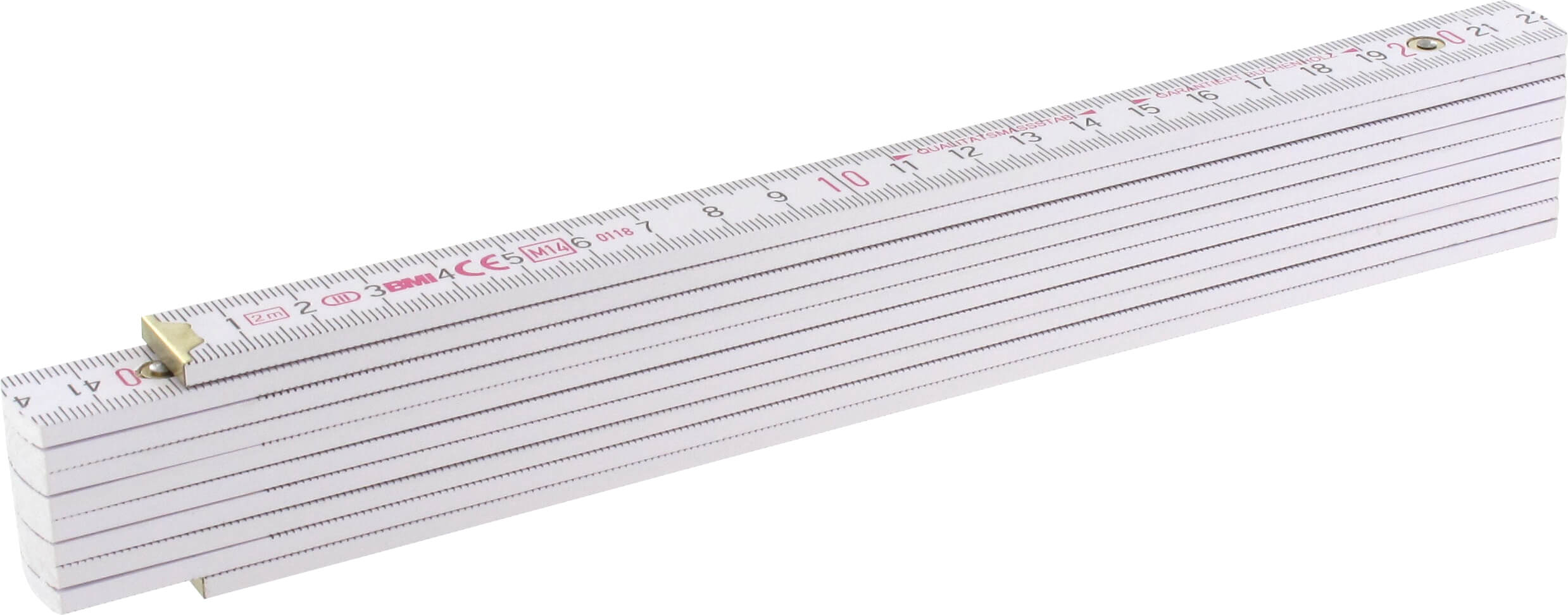 BMI, aus Buchenholz, Gliederstärke 3,0 mm, Gliederhöhe 16 mm, Gliederzahl 10, innenliegende durchgenietete Gelenkfedern aus standfestem Kunststoff, Winkeleinteilung in der Gelenkverbindung des ersten Maßstabgliedes, durch die eingelassenen Gelenke entsteht im ausgeklappten Zustand eine durchgehend gerade Kante,weiße Lackierung, 2m Länge mit Duplex-Teilung. EG Genauigkeitsklasse: III 2 m