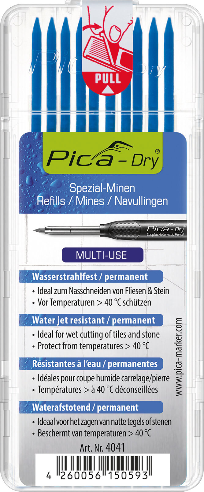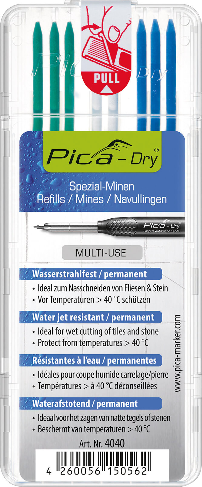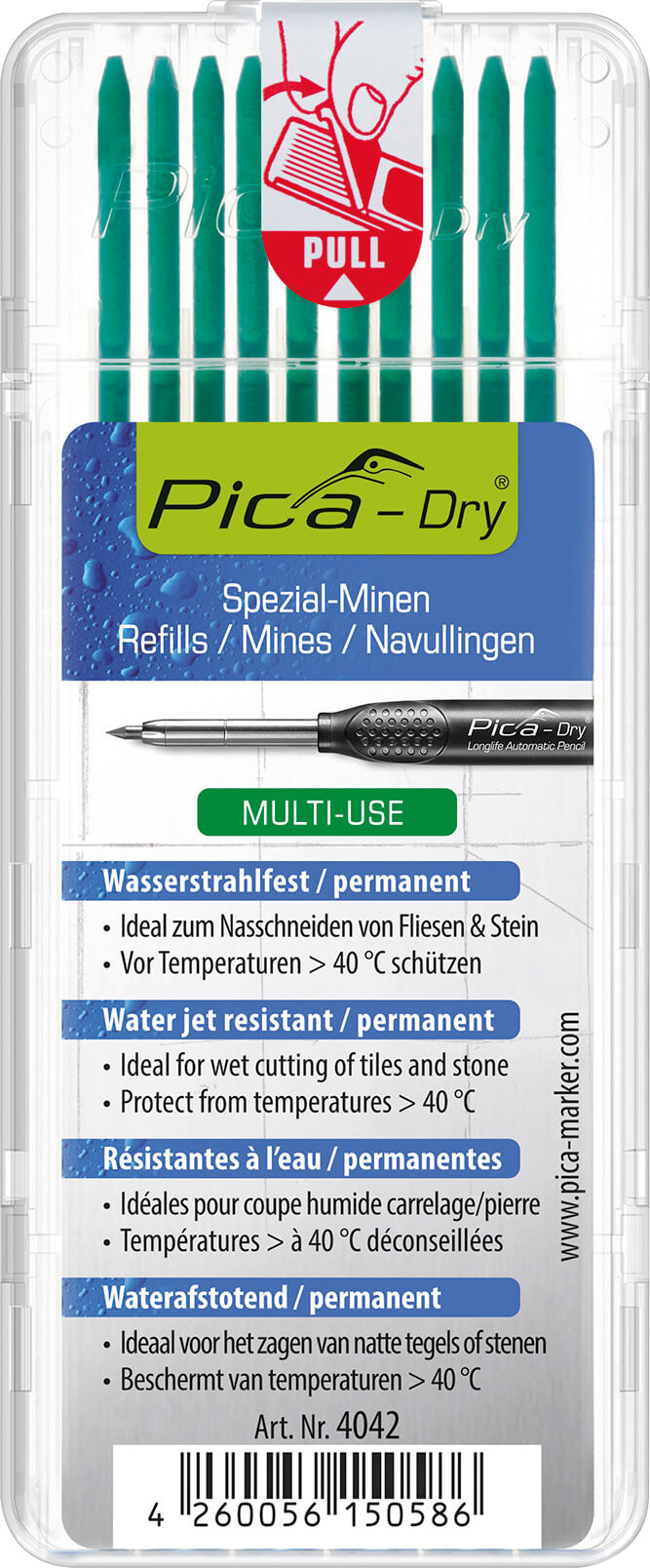 Pica, in einer praktischen und robusten Kunststoffbox, ø 2,8 mm x 125 mm, angespitzt, Spezial-Minen: wasserstrahlfest, für fast alle Oberflächen - egal ob trocken oder feucht, glatt oder rau, staubig oder ölig, hell oder dunkel, ideal zum Nassschneiden von Fliesen und Stein, Chlorid-frei 10x grün