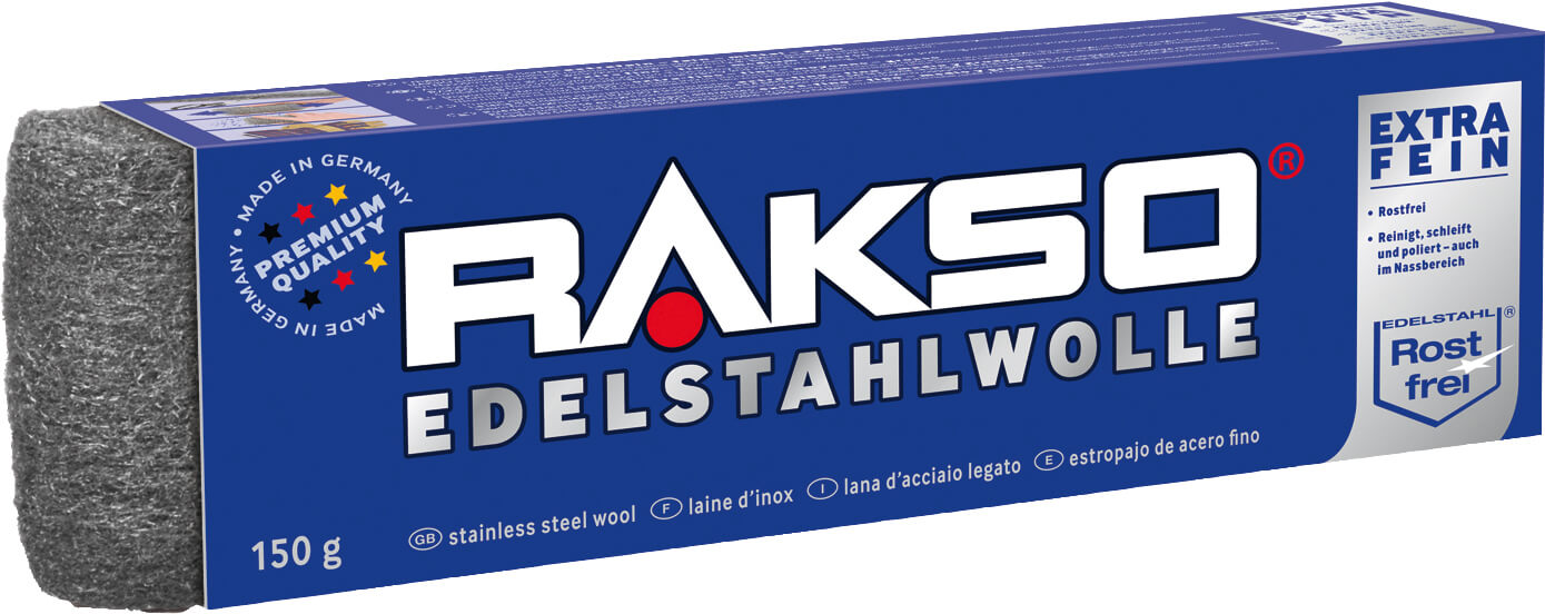 RAKSO, Universalprodukt zum Schleifen, Polieren und Reinigen unterschiedlichster Oberflächen aus Holz, Metall, Kunststoff, Glas und Stein, aus 1 A - Gütestahl, sortenreine Stahlwollebänder Edelstahlwolle, 150 g