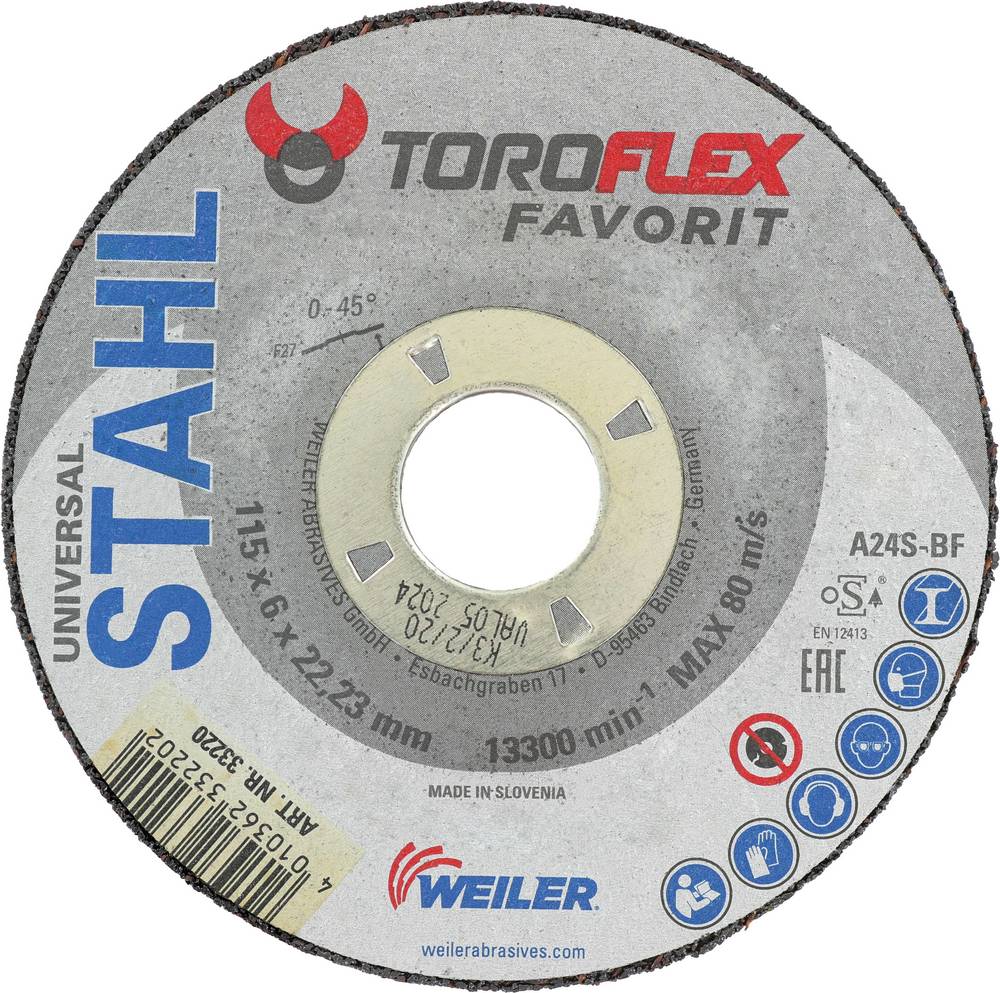 toroflex, bewährte Universalscheibe für den Kantenschliff und Entgratungsarbeiten in allen Bereichen der Metallbearbeitung, Innen-ø 22,2 mm, 115 mm / 125 mm gekröpft, 178 mm flach ø 115 x 6 mm